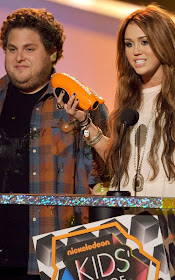 Miley Cyrus recibe su dirigible naranja por su premio a Actriz Favorita de Cine en los Kids Choice Awards 2010, celebrado en el Pauley Pavilion de la UCLA, en Los Angeles, hoy sábado 27 de marzo de 2010.